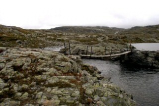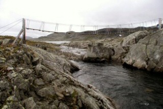 Om over de Ustekveikja, een riviertje dat uitmondt in het Finsevatnet, te komen waren er deze twee hang bruggetjes.