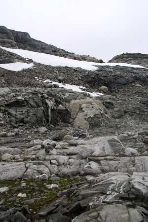 Dan een stukje omhoog en via het kleine stukje ijs (wit) weer naar links. Vervolgens boven het grote stuk ijs weer naar rechts en de berg over bij het laagste gedeelte.